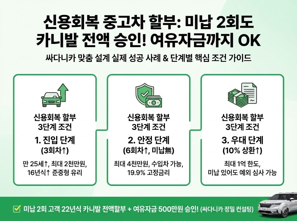 | 신용회복 중고차 할부 미납 3회 있어도 승인? 싸다니카의 3가지 맞춤 솔루션 (0) | 2026.01.01 |